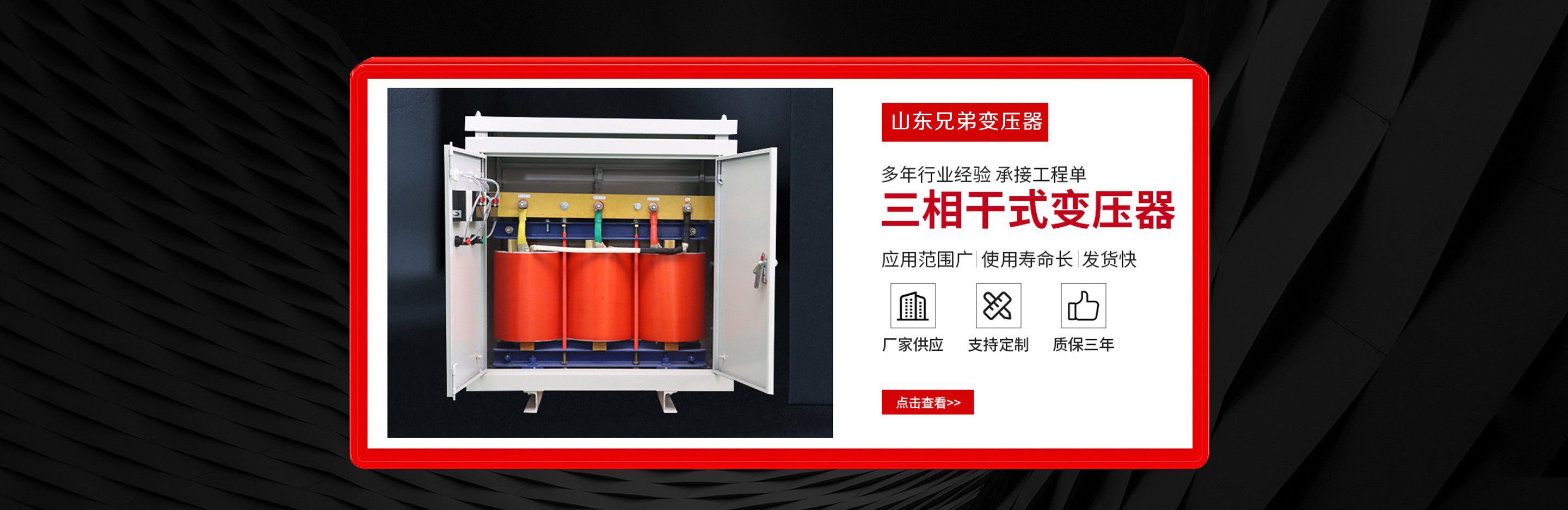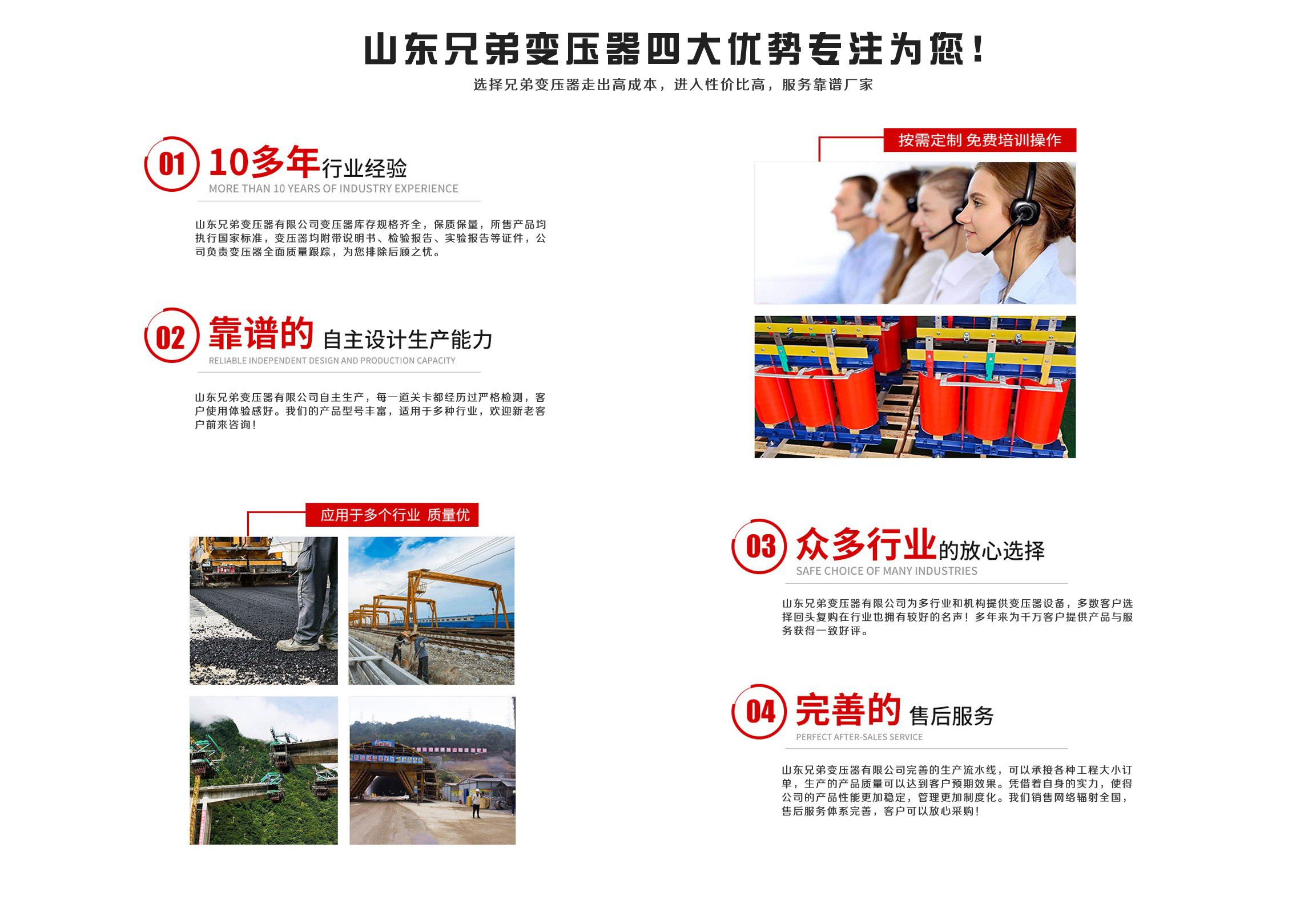 山東兄弟變壓器有限公司經營SCB10干式變壓器,SCB11干式變壓器價格,SCB12變壓器,SCB13干式變壓器,SCB14干式變壓器,SCB18干式變壓器等產品及用戶要求的特殊變壓器?! 」镜馁|量方針是:“顧客的滿意,是我公司的追求?!眻猿仲|量,用戶至上,以質興業,以優取勝,愿為廣大用戶設計各種要求的變壓器,以求共同發展。 企業精神:“創新、求實、誠信、高效”。 企業作風:“嚴、細、實、快”?! ∑髽I工作方針:“加強內部管理,夯實基礎,全面提高職工整體素質,使企業管理水平再上新的臺階”。 公...